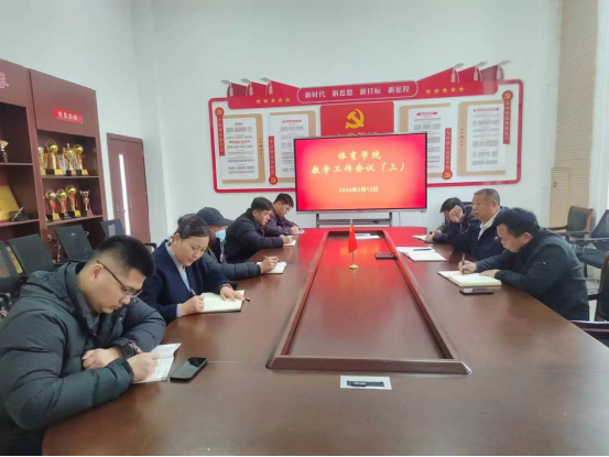体育学院召开2023-2024第二学期教学工作会议,旨在全面部署教学工作任务,进一步推动学院各项工作的深入开展。体育学院院长徐长宇、党总支书记范伟杰、副院长李海磊、宋理国出席会议并讲话,体育学院全体教研室主任及教师代表共同参会,会议由范伟杰主持。